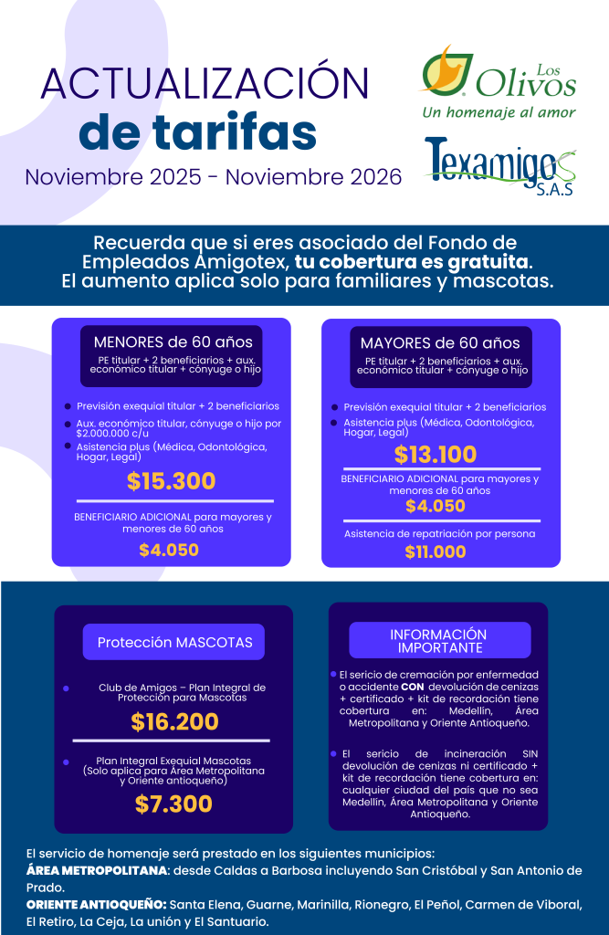 Todas las personas que ingresan a nuestro Fondo de Empleados Amigotex tienen cobertura exequial gratuita después de su primer mes de afiliación gracias a nuestro convenio con Previsora Exequial LOS OLIVOS.