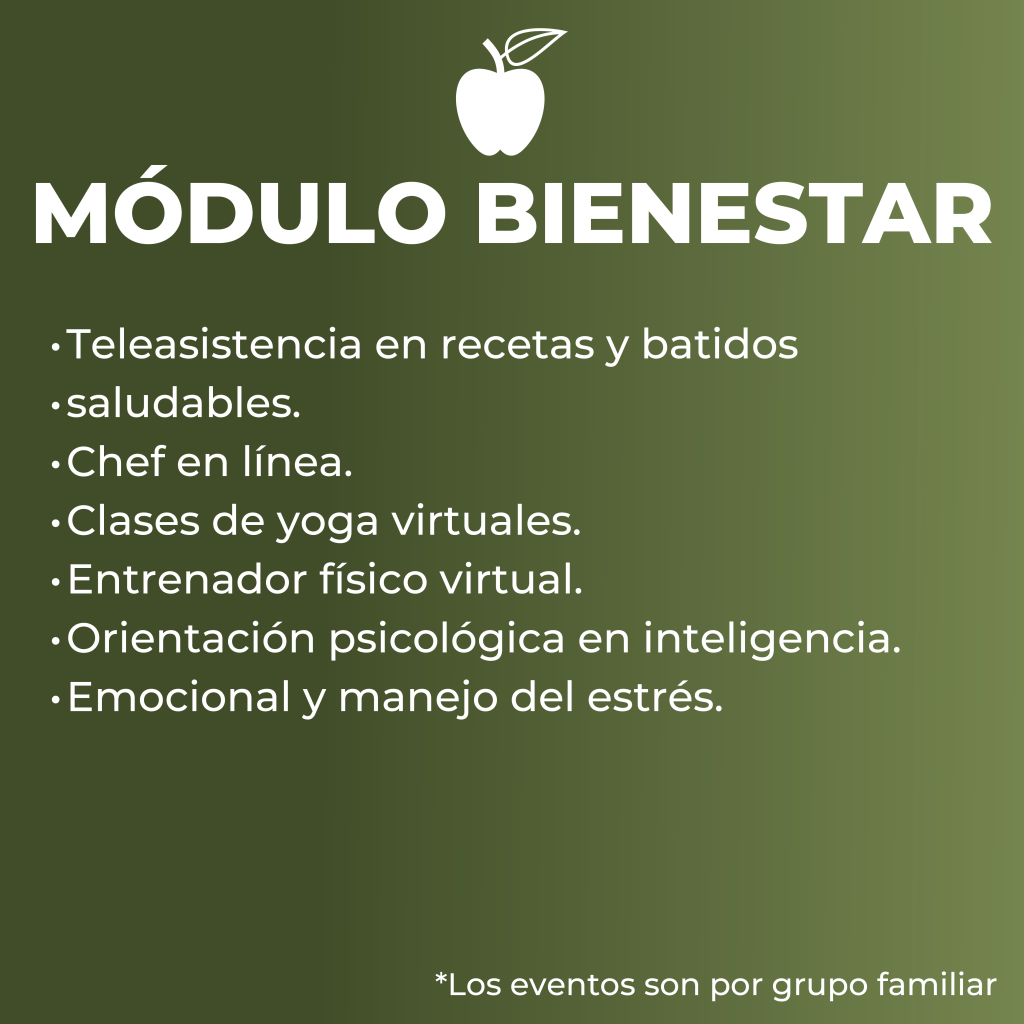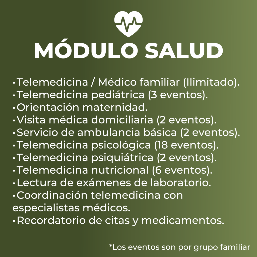 1. Consultas con médico general. 2. Orientación médica para síntomas comunes (gripa, fiebre, dolor de cabeza, malestar estomacal, etc.). 3. Formulación de medicamentos básicos. 4. Lectura e interpretación de exámenes.